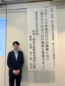 令和7年10月26日(土)にプレスタワー17階静岡新聞ホールにて、講師に東京科学大学大学院地域・福祉口腔機能管理学分野の松尾浩一郎教授をお迎えし市民公開講座が開催されました。